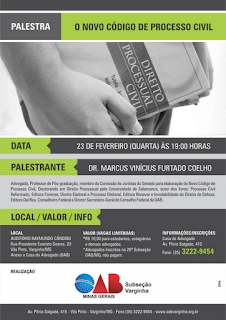 A OAB Varginha, com o apoio da Seccional Mineira, realizará no dia 23/02, às 19 horas, no Auditório da OAB, à Rua Presidente Evaristo Soares, 20 – Vila Pinto, palestra sobre o tema: O Novo Código de Processo Civil. Estará ministrando a referida palestra o Dr. Marcus Vinicius Furtado Coelho, Advogado, professor de pós-graduação, membro da Comissão de Juristas do Senado para elaboração do Novo Código de Processo Civil, doutorando em Direito Processual pela Universidade de Salamanca, autor dos livros: Processo Civil Reformado, Editora Forense; Direito Eleitoral e Processo Eleitoral, Editora Renovar e Inviolabilidade do Direito de Defesa, Editora Del Rey. Conselheiro Federal e Diretor Secretário-Geral do Conselho Federal da OAB.